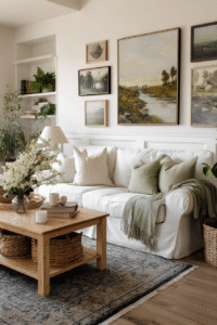 Seasonal art swaps are flexible living room art ideas that keep decor exciting. Light and bright art works well in summer, while warm tones suit winter. This modern home decor living room wall art approach is budget-friendly and fun. It allows easy updates without permanent changes. Seasonal art keeps your living room feeling new all year.