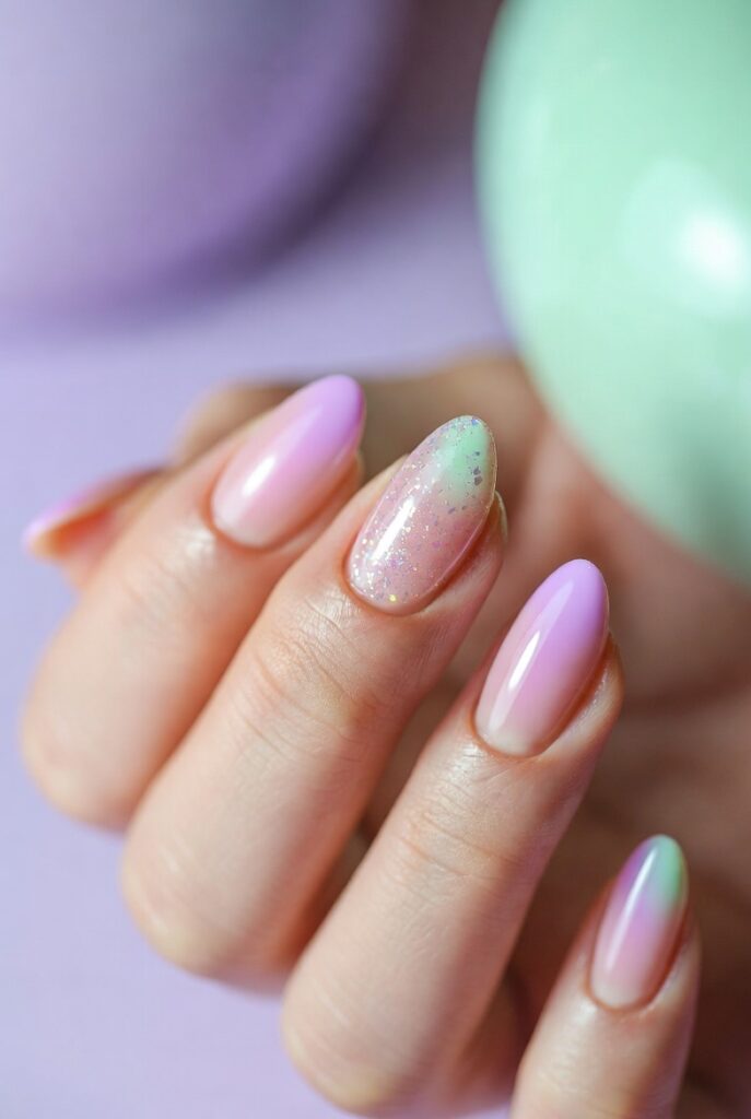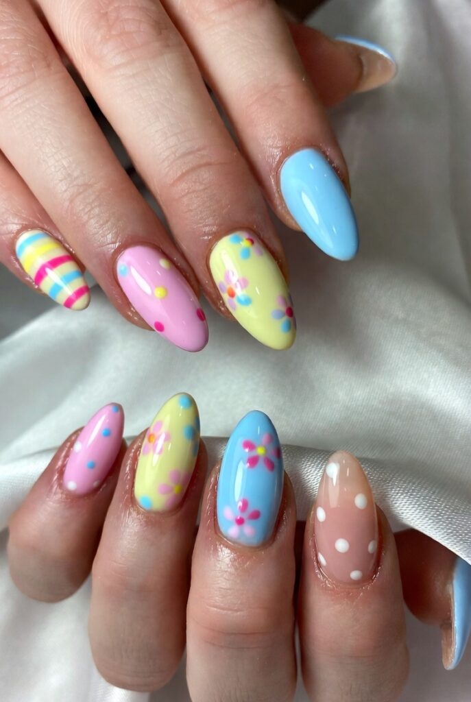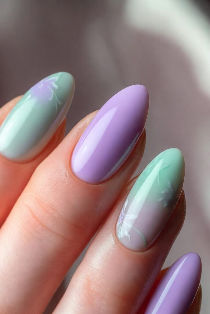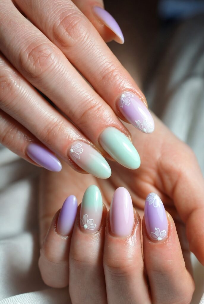Elegant shape and soft colors make almond pastel nails perfect for spring.