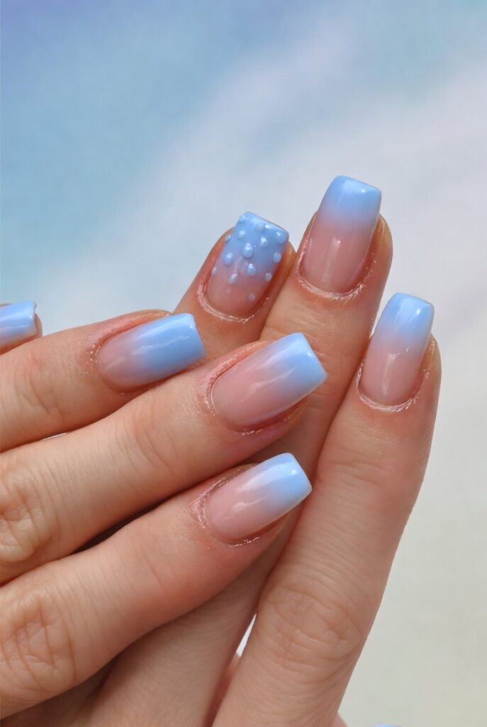 Light blue ombre nails are calm and stylish March nail ideas. The smooth blend of soft blue shades creates a peaceful spring look. These spring nail designs work best on slightly longer nails where the gradient effect shows clearly. Ombre March manicure ideas feel trendy but still elegant. The soft transition of color makes your nails look neat and modern.