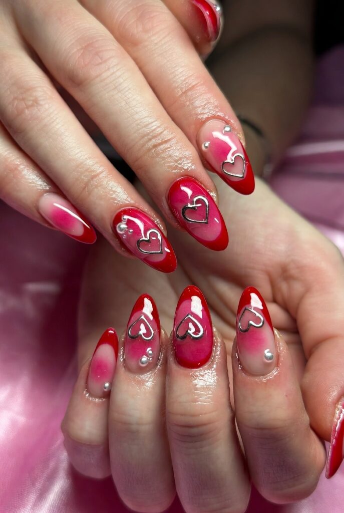 French tips are making a strong comeback in Valentines Nails Ideas with a romantic upgrade. For Valentine’s Day nail designs 2026, red tips, soft pink edges, and tiny heart-shaped French tips are trending everywhere. This style looks clean, modern, and very polished. You can keep the base nude or sheer for a classy feel while adding Valentine details on the tips. These romantic nail art ideas are perfect if you want trendy Valentine nails that feel elegant, timeless, and suitable for both daily wear and special dates.