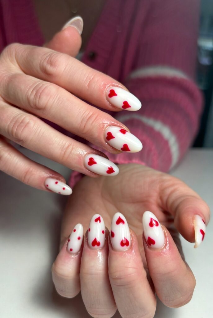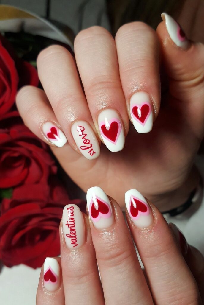 White nails are a clean and elegant option in Valentines Nails Ideas. In Valentine’s Day nail designs 2026, white bases with red hearts, pink accents, or minimal lines are trending. This color creates a fresh and modern Valentine look that feels light and stylish. White Valentine nails match every outfit and nail length. If you prefer simple yet romantic romantic nail art ideas, white nails with subtle Valentine details make beautiful trendy Valentine nails.