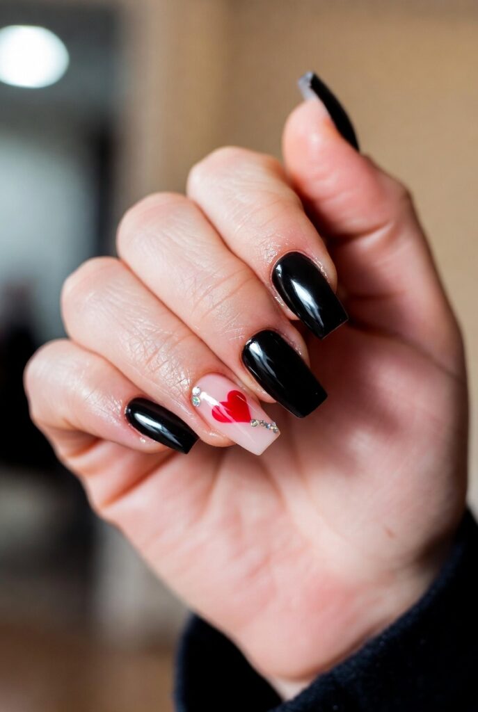 Black nails bring a bold twist to classic Valentines Nails Ideas. In Valentine’s Day nail designs 2026, black bases with red hearts, pink accents, or glossy finishes are trending. This style feels modern, confident, and slightly edgy while still keeping romantic vibes. Black Valentine nails are perfect for people who like unique and statement looks. You can balance the bold color with minimal heart designs or soft details. These trendy Valentine nails are ideal for confident personalities who love standout romantic nail art ideas.
