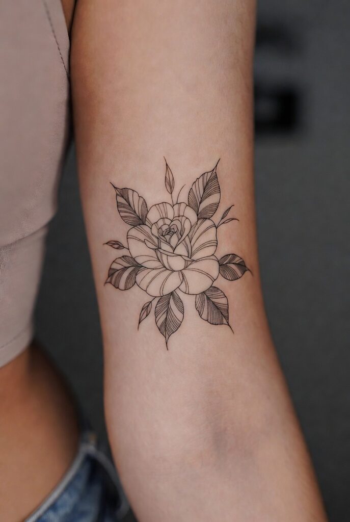 Fine line rose designs are timeless women tattoos loved for their romantic and classic feel. These beginner tattoos are simple yet detailed enough to look elegant. Rose tatoos symbolize love, beauty, and strength. They are often placed on the wrist, forearm, or shoulder for a soft feminine look.