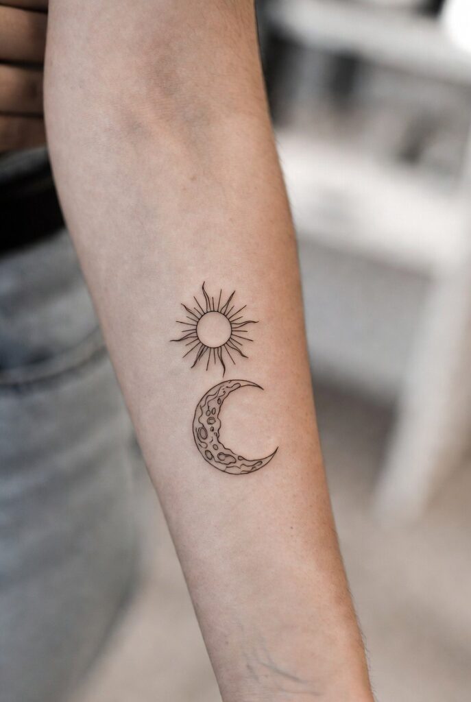 Sun and moon designs are symbolic women tattoos representing balance and harmony. These beginner tattoos can be created in a small minimal style, making them trendy and easy to wear. Many women choose sun and moon tatoos for their deep emotional meaning. They look elegant on the wrist, ankle, or forearm.
