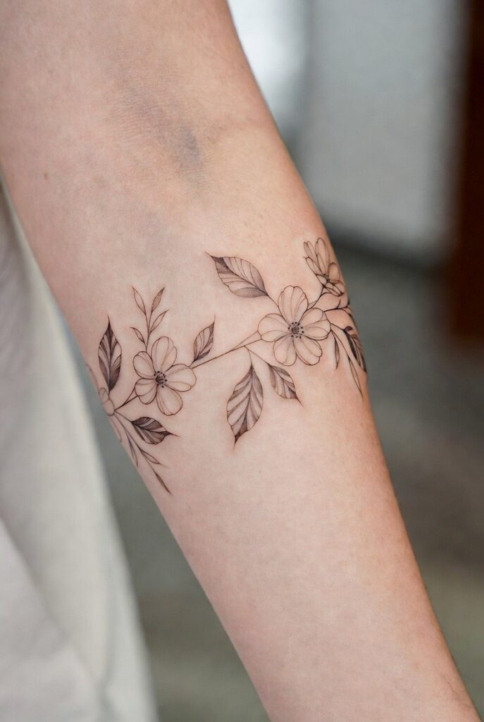 Floral arm band designs are elegant women tattoos that wrap softly around the arm. A thin floral band looks balanced, modern, and feminine. These beginner tattoos are stylish without being overwhelming for first-time tattoo lovers. Floral arm band tatoos symbolize beauty, growth, and harmony. They create a graceful look while staying meaningful and trendy.